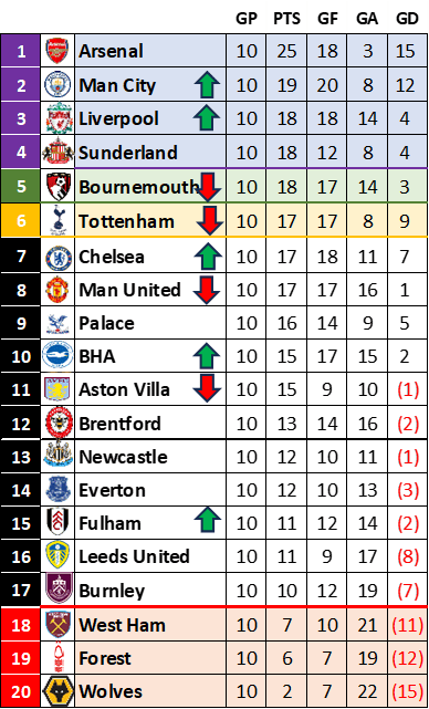 Current Table (Arrows represent a team that moved up or down 2+ spots or into/out of Europe/Relegation) ![]()