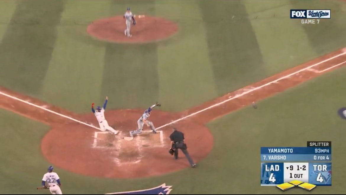 In Game 3 there was a controversial play in the second inning. Varsho was batting for Toronto with a runner on first and nobody out. It appeared he took ball 4, yet the umpire clearly called it a strike. Varsho dropped his bat and started to walk to first and baserunner Bichette then started to walk to second base. A heads up play by the Dodgers, as they heard the strike call and threw down to first to pick off the baserunner. Varsho then walked, but instead of runners on first and second, there was now an out and a runner on first. The next batter singled to put runners on first and third, and if a runner were on second, they would’ve scored. Toronto did not score in the inning.