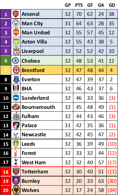 Brentford stay in the final European Spot just over Everton, with BHA, Sunderland, Bournemouth and Fulham in hot pursuit.