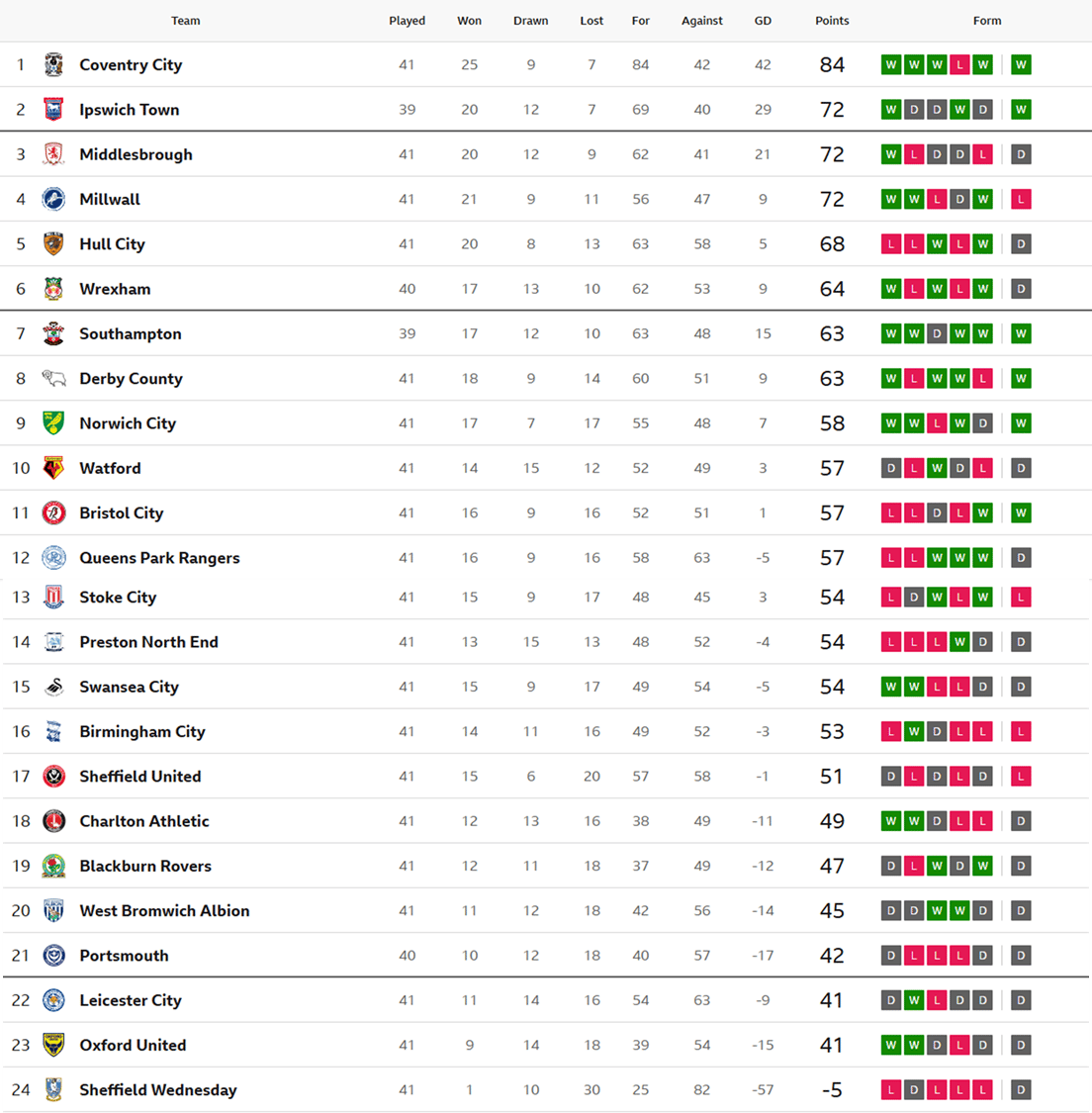 Coventry City look like they will win the table. Looks like Frank Lampard will be coaching in the PL next season. The former Chelsea star will bring some great storylines.