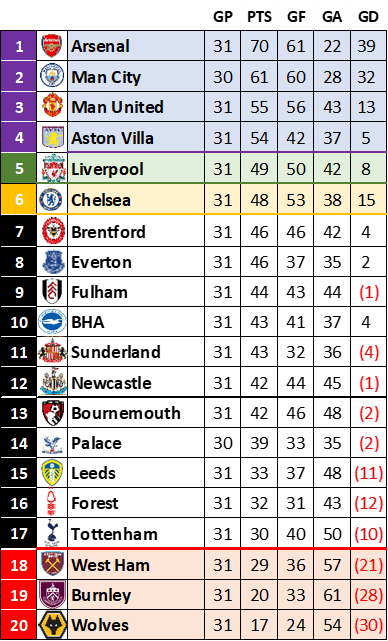 West Ham (29 points), Spurs (30), Forest (32) and Leeds (33).
